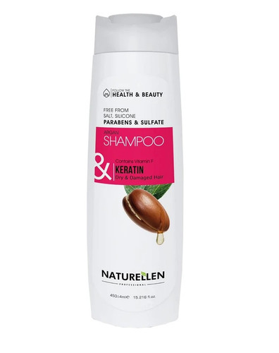 نچرالن، شامپو بدون سولفات و پارابن کراتین و آرگان مناسب موهای خشک و آسیب دیده 450 میل