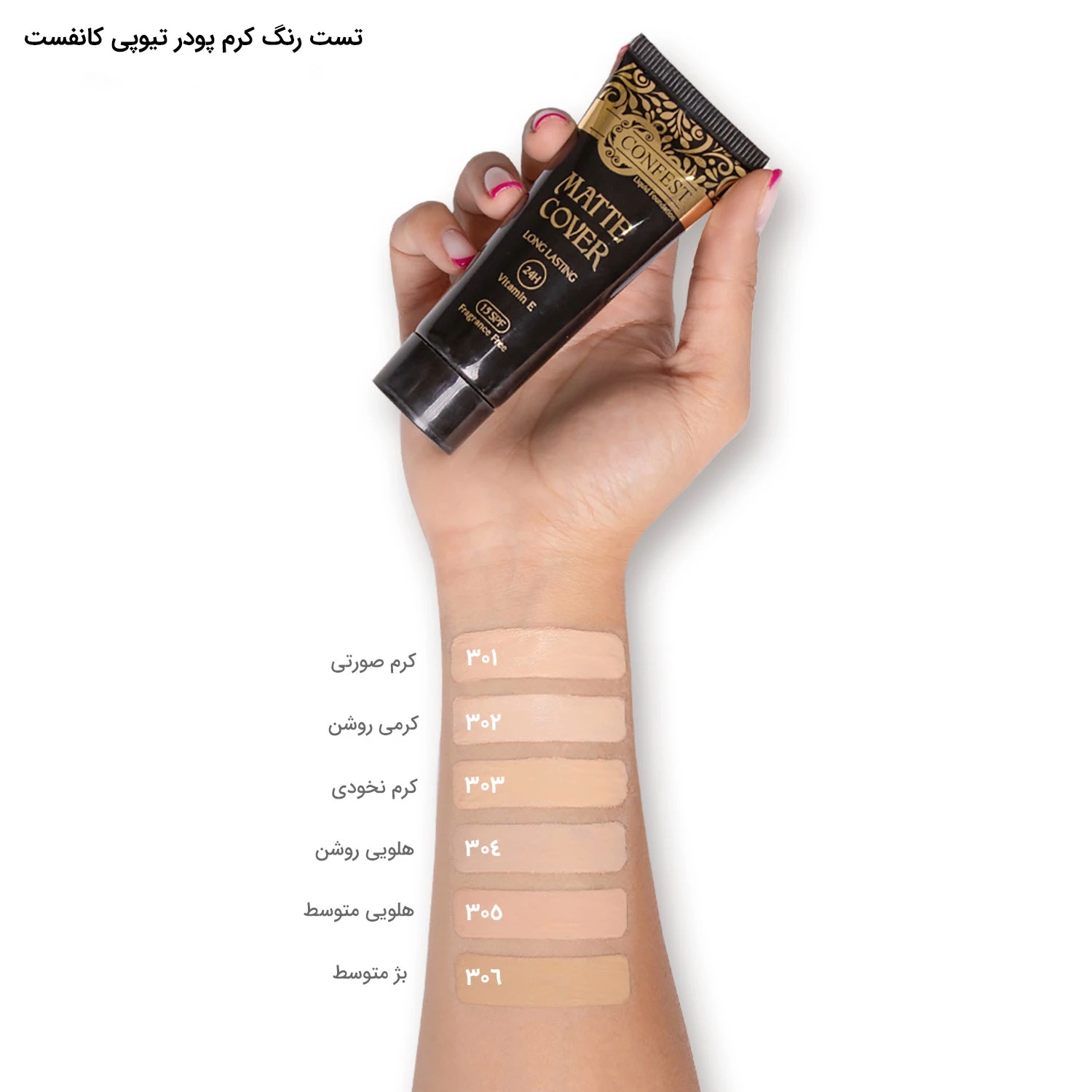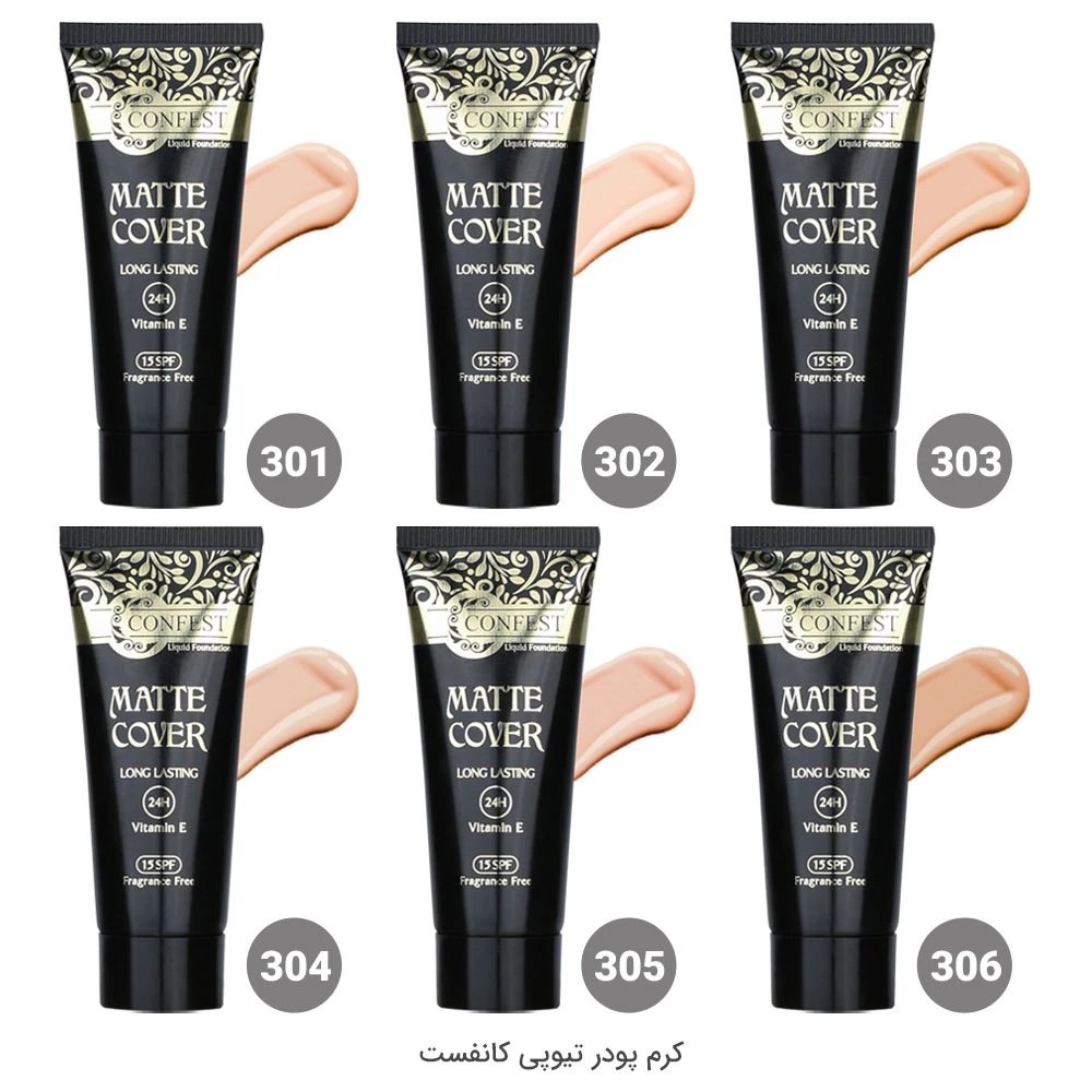 کرم پودر تیوپی کانفست در شش رنگ حاوی SPF 15 می باشد که باعث محافظت پوست در برابر اشعه آفتاب می شود. کرم پودر تیوپی کانفست در شش رنگ برای پوست های با تناژ رنگهای 301تناژ صورتی _ 302 کرم روشن _ 303 کرم نخودی _ 304 هلوی روشن _ 305 هلویی متوسط _306 بژ متوسط مناسب است و در گروه رنگی با هر سلیقه رنگی تنوع دارد . کرم پودر کانفست فاقد بو می باشد و می تواند احساس سبکی و سرحالی را منتقل کند. کرم پود تیوپی کانفست حاوی ویتامین E و آبرسان می باشد که مانع از خشکی و آسیب دیدنن پوست صورت می شود همچنین برای انواع پوست های خشک، مختلط و چرب مناسب است و با ایجاد نمایی مات و طبیعی باعث زیباتر شدن پوست صورت می شود. کرم پودر تیوپی کانفست قدرت پوشانندگی بالایی دارد و می تواند تیرگی ها و لکه های پوستی را به خوبی بپوشاند و پوششی یک دست و صاف را ایجاد نماید. کرم پودر تیوپی کانفست مایع می باشد و باعث می شود به خوبی بر روی پوست بنشیند و بافتی نرم و مخملی را بوجود بیاورد. کرم پودر کانفست هیچگونه احساس سنگینی و خستگی را در پوست ایجاد نمی کند و حالتی شاداب و سرحال را در پوست بوجود می آورد. تمامی محصولات کانفست فاقد تست حیوانی میباشد.
